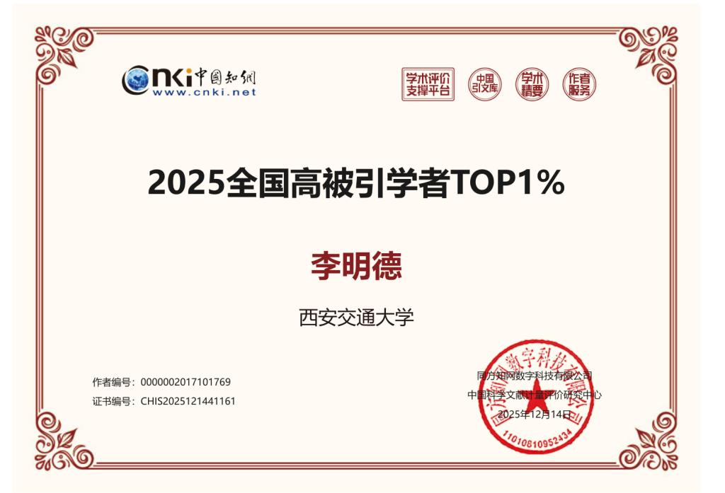 其中,西安交通大学新闻与传播研究所李明德教授连续2年入选新闻传播学科“高被引学者Top 1%”。